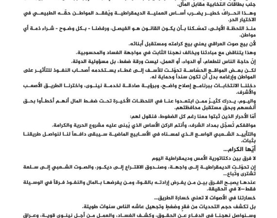 - رئيس حزب نينوى لاهلها : المال السياسي شوّه انتخابات نينوى… وسنواصل طريق الإصلاح مهما كانت التحديات