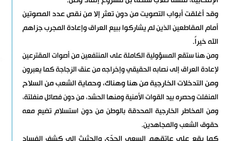 موصل تايم أثارت تغريدة السيد مقتدى الصدر، التي نشرها مباشرة بعد إغلاق صناديق الاقتراع، موجة واسعة من القراءات المتباينة، بعدما حملت لهجة تحذيرية واضحة من “إعادة العراق إلى ساحة الفساد” مع تأكيد أنه “سيتحرك مستقبلاً” إذا اقتضت الظروف. وبعد ساعات من التغريدة،…