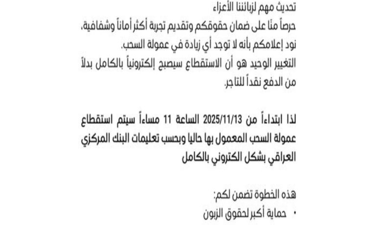 موصل تايم أعلنت شركة (كي) للخدمات المالية، اليوم عن تحديث مهم في آلية استقطاع عمولة السحب، مؤكدة أنه لا توجد أي زيادة في قيمة العمولة المقررة حالياً. وذكرت الشركة، في بلاغ لعملائها، تلقاه راديو “موصل تايم”، أن “التغيير الوحيد يكمن في تحويل…