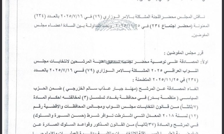 المفوضية تقرر استبعاد “مهند الخزرجي” المرشح الفائز بانتخابات تشرين 2025 النيابية (وثيقة) موصل تايم أظهرت وثيقة صادرة عن المفوضية العليا المستقلة للانتخابات بتاريخ، اليوم الثلاثاء (25 تشرين الثاني 2025)، قرارا يقضي باستبعاد المرشح الفائز “مهند الخزرجي” بانتخابات تشرين 2025 لعدم توفر شرط…
