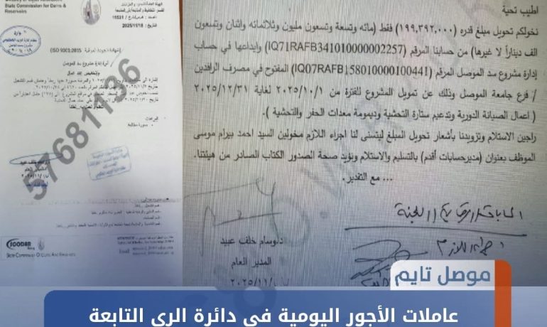 اشتكت مجموعة من النساء العاملات ضمن شريحة الأجور اليومية في دائرة الري التابعة لمشروع سد الموصل من قرار إقصائهن عن العمل، رغم تأكيدهن أن الدائرة حصلت على التمويل الخاص بأجورهن لثلاثة أشهر وفق كتاب رسمي. وقالت العاملات في مناشدة تابعتها “موصل تايم…