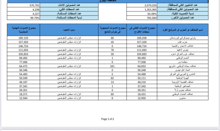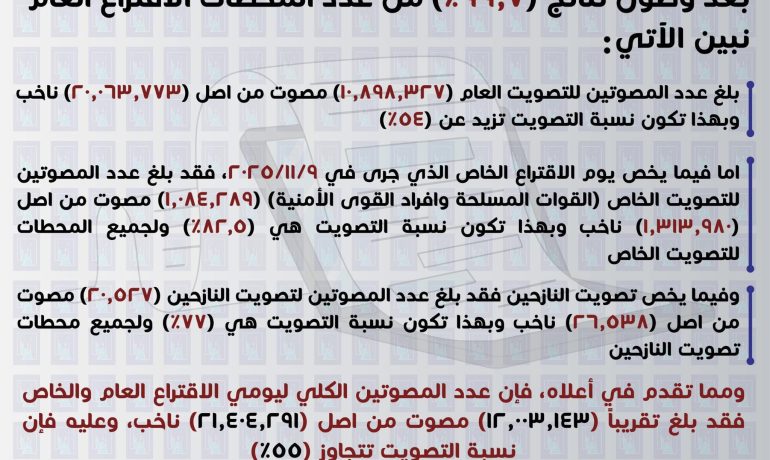 المفوضية: نسبة المشاركة في الانتخابات النيابية العراقية تجاوزت الـ 54% المفوضية العليا المستقلة للانتخابات: بلغ عدد المصوتين للتصويت العام (10,898,327) مصوتاً من أصل (20,063,773) ناخباً وبهذا تكون نسبة التصويت تزيد عن (54%) بلغ عدد المصوتين للتصويت الخاص (القوات المسلحة وأفراد القوى الأمنية)…
