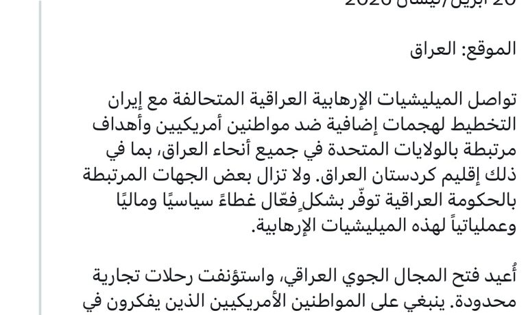 موصل تايم اتهمت السفارة الأمريكية في العراق، اليوم الاثنين، جهات مرتبطة بالحكومة العراقية بتوفير غطاء سياسي ومالي وعملياتي لميليشيات وصفتها بـ”الإرهابية”، وذلك في بيان رسمي حمل عنوان “التحذير الأمني للمواطنين الأمريكيين المتواجدين في العراق”. وذكر البيان أن “الميليشيات الإرهابية العراقية المتحالفة مع…