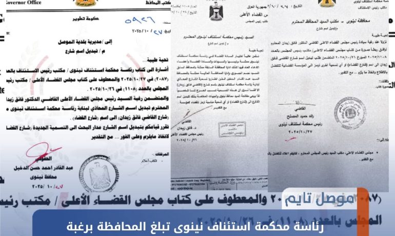 حصلت موصل تايم ، اليوم الأربعاء، على وثائق رسمية تُظهر توجيه رئاسة محكمة استئناف نينوى إلى محافظة نينوى بشأن رغبة رئيس مجلس القضاء الأعلى القاضي فائق زيدان بتبديل اسم الشارع المحاذي لبناية رئاسة محكمة الاستئناف من “شارع القاضي فائق زيدان” إلى “شارع…