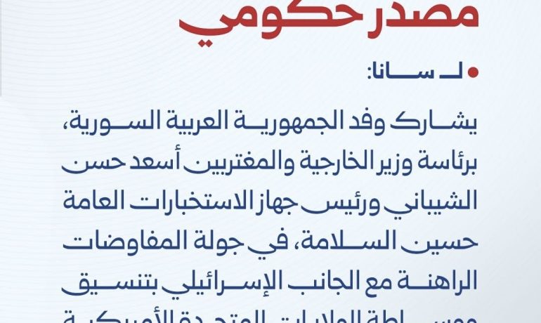 اعلن مصدر حكومي بأن وفد الجمهورية العربية السورية، برئاسة وزير الخارجية والمغتربين أسعد حسن الشيباني ورئيس جهاز الاستخبارات العامة حسين السلامة، يشارك في جولة المفاوضات الراهنة مع الجانب الإسرائيلي بتنسيق ووساطة الولايات المتحدة الأمريكية. وقال المصدر الحكومي لـ سانا: إن استئناف هذه…