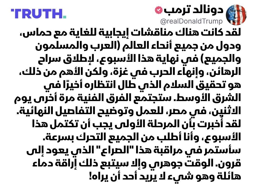 “الوقت جوهري وإلا ستحدث إراقة دماء هائلة”.. ترمب على تروث سوشيال: أُخبرت أن المرحلة الأولى من خطة إنهاء الحرب في غزة يجب أن تكتمل هذا الأسبوع، وأطلب من الجميع التحرك بسرعة