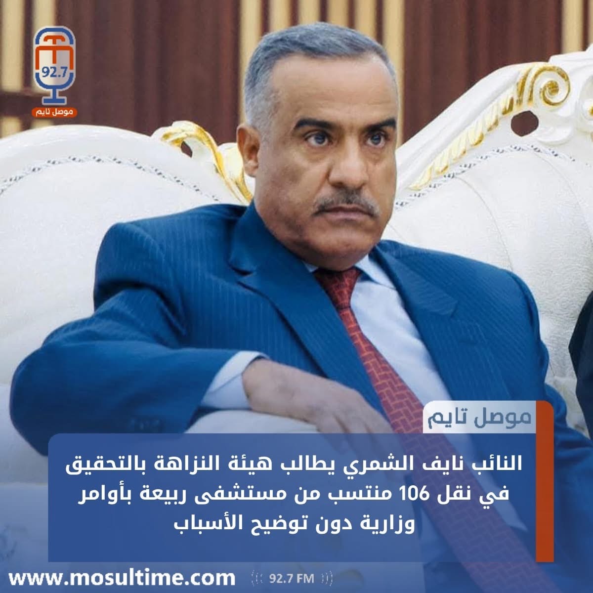 طالب النائب عن محافظة نينوى نايف الشمري، اليوم الاثنين، هيئة النزاهة بفتح تحقيق عاجل بشأن نقل أكثر من مئة منتسب من مستشفى ربيعة، بعد صدور أوامر وزارية بنقلهم إلى مواقع أخرى دون بيان الأسباب.