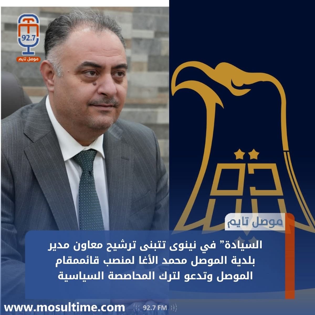 أعلنت كتلة السيادة في محافظة نينوى، اليوم الخميس، تبنيها ترشيح معاون مدير بلدية الموصل المستقل محمد الأغا لمنصب قائممقام الموصل، مؤكدة أن خيارها جاء استناداً إلى الإرادة المجتمعية، لا إلى المحاصصة السياسية، داعية بقية الأطراف إلى تغليب مصلحة المدينة على الخلافات الانتخابية الضيقة.