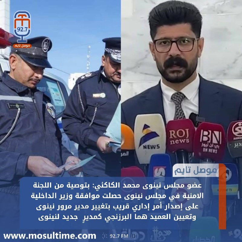 أفاد عضو مجلس محافظة نينوى ورئيس اللجنة الأمنية محمد الكاكئي، اليوم الأحد، بأن وزير الداخلية وجّه بتغيير مدير مرور نينوى اللواء عواد السورجي، وتعيين العميد هما البرزنجي بديلاً عنه، مؤكداً أن الأمر الإداري سيصدر رسمياً خلال الأيام القليلة المقبلة. وأوضح الكاكئي في تصريح تابعته” موصل تايم ” أن هذا التغيير جاء بتوصية من اللجنة الأمنية في مجلس المحافظة، وبموافقة وزير الداخلية، بهدف تطوير أداء مديرية مرور نينوى وتعزيز الجهود المبذولة في تنظيم حركة السير داخل مدينة الموصل وبقية مناطق المحافظة. وأشار إلى أن القيادة الأمنية في نينوى تعكف على إجراء سلسلة من التغييرات الإدارية ضمن خطة تهدف إلى رفع مستوى الأداء الأمني والخدمي في المحافظة.