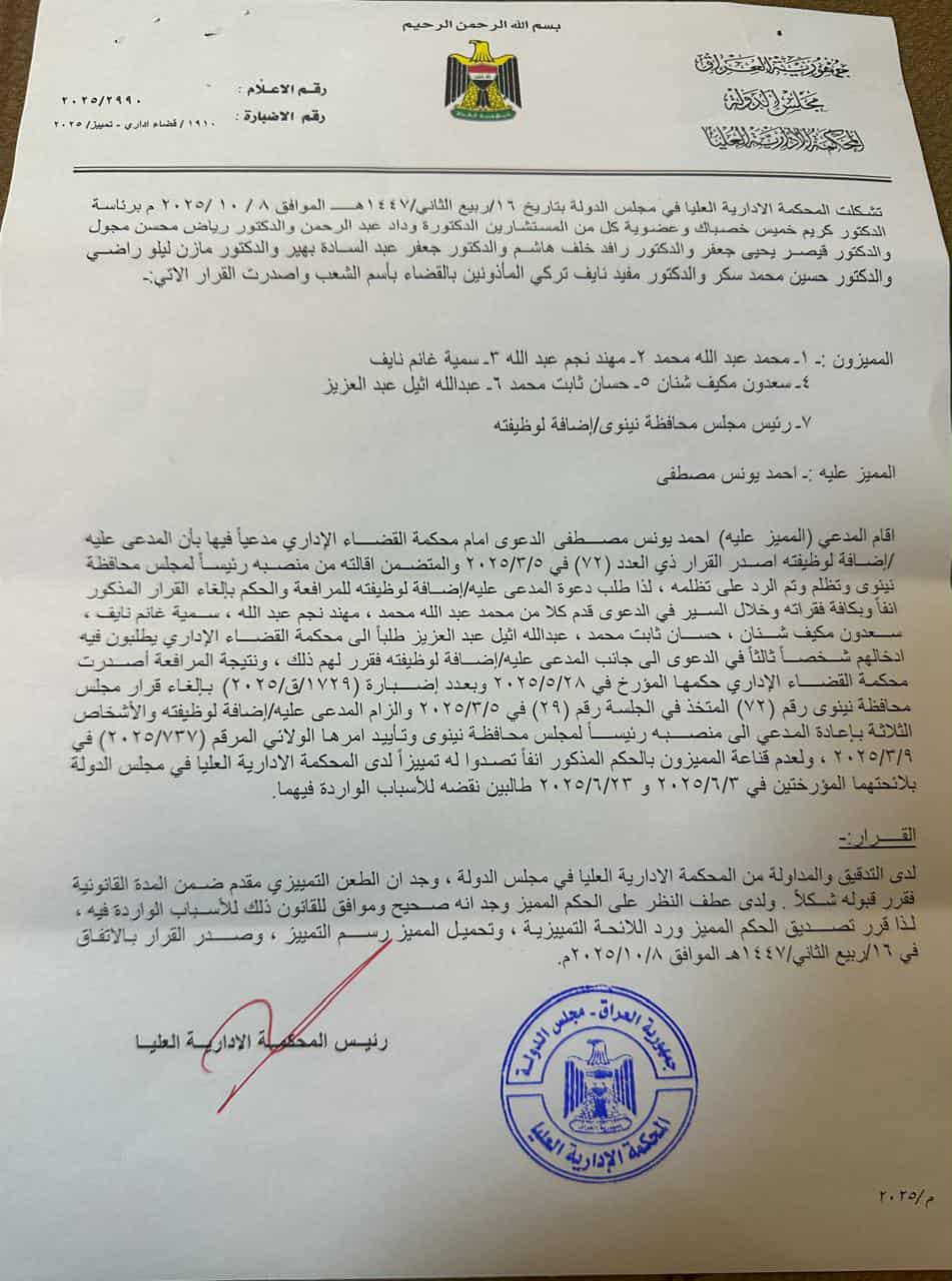 ويعد هذا القرار ملزماً ويعيد رئيس مجلس محافظة نينوى أحمد الحاصود إلى منصبه، بعد أشهر من الجدل السياسي والقانوني حول شرعية قرار الإقالة.