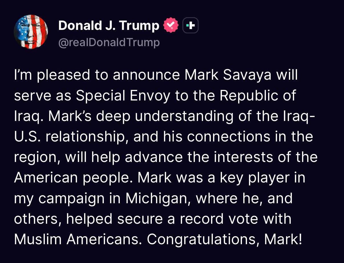 ترامب : فهم مارك العميق للعلاقات بين بغداد وواشنطن سيسهم في تعزيز مصالح الشعب الأمريكي