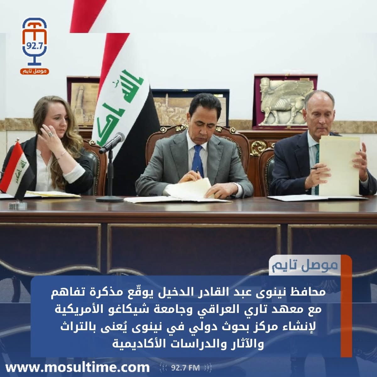 أعلن محافظ نينوى عبد القادر الدخيّل، اليوم الأربعاء، توقيع مذكرة تفاهم مع معهد البحوث الأكاديمية في العراق (تاري) ومعهد الدراسات والثقافات القديمة في جامعة شيكاغو الأمريكية، لإنشاء مركز بحوث أكاديمي دولي في نينوى، مؤكداً أن المشروع يمثل خطوة استراتيجية لتعزيز مكانة المحافظة كمركز علمي وثقافي.