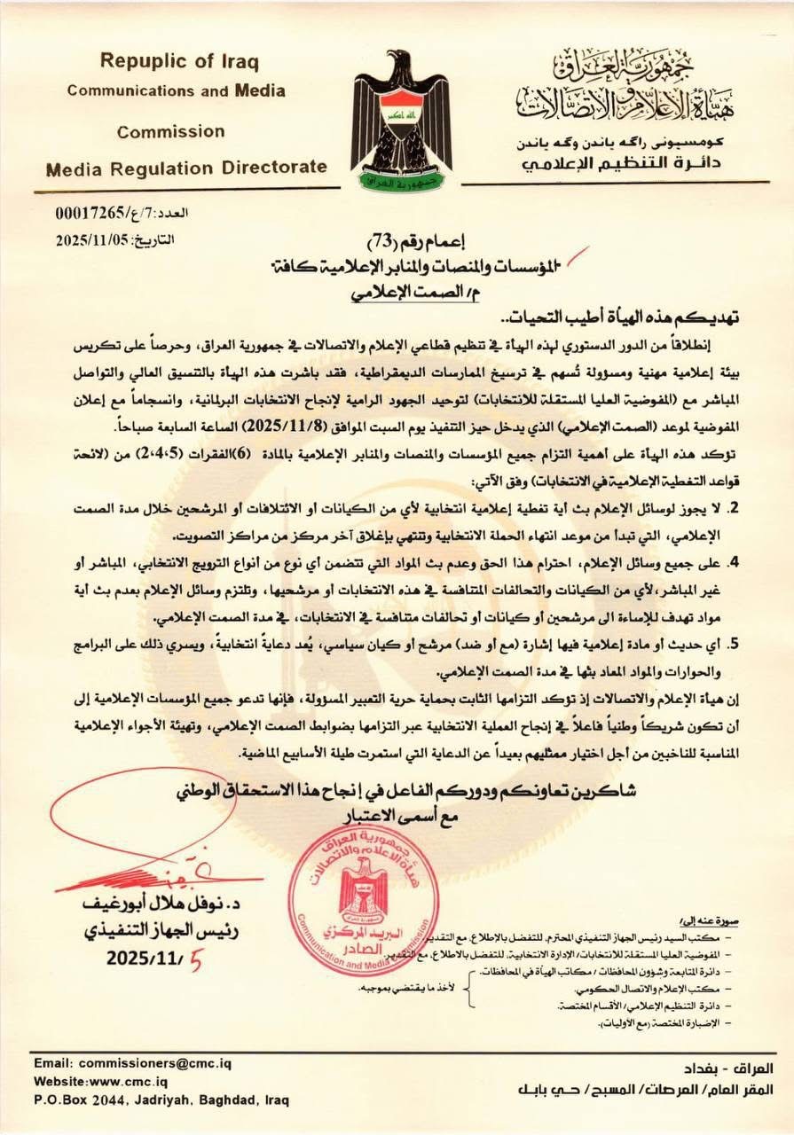 والتاكيد على جميع وسائل الإعلام، احترام هذا الحق وعدم بث المواد التي تتضمن أي نوع من أنواع الترويج الانتخابي، المباشر أو غير المباشر، لأي من الكيانات والتحالفات المتنافسة في هذه الانتخابات أو مرشحيها، وتلتزم وسائل الإعلام بعدم بث أية مواد تهدف للإساءة الى مرشحين أو كيانات أو تحالفات متنافسة في الانتخابات، في مدة الصمت الإعلامي التي تبدأ الساعة 7 مساء يوم السبت 8 تشرين الثاني 2025 وحتى انتهاء عملية الاقتراع.