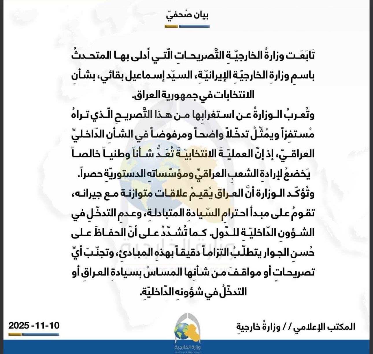 أعربت وزارة الخارجيّة ، اليوم الاثنين (10 تشرين الثاني 2025)، عن استغرابها من التصريحات التي أدلى بها المتحدث باسم وزارة الخارجية الإيرانية إسماعيل بقائي بشأن الانتخابات في العراق، مؤكدة أن العملية الانتخابية شأن داخلي خالص يخضع لإرادة الشعب العراقي ومؤسساته الدستورية.