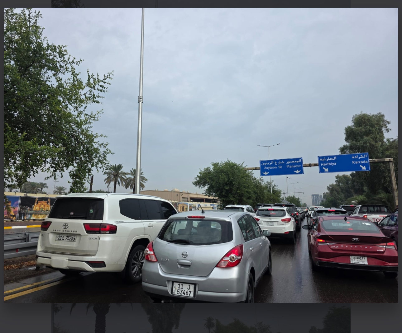 وقال مراسل “موصل تايم” إن الطريق المؤدي إلى أحد مداخل المنطقة الخضراء تعرض لاختناق مروري حاد بعد تساقط الأمطار الغزيرة، ما أدى إلى بطء كبير في حركة المركبات قبل أن تتوقف الحركة بشكل شبه كامل.