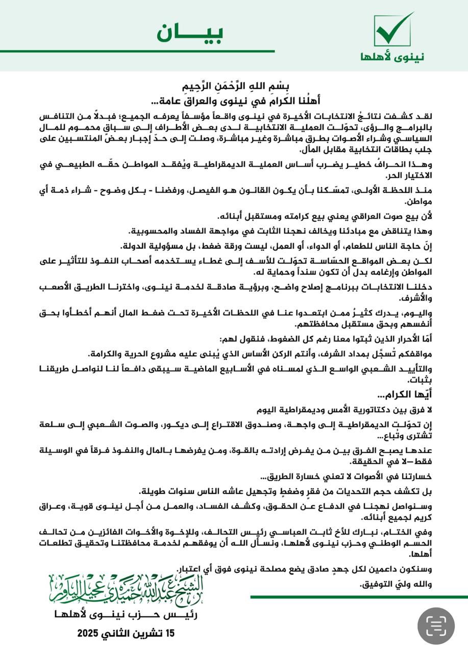 أصدر رئيس حزب نينوى لأهلها الشيخ عبدالله حميدي عجيل الياور، اليوم السبت، بياناً شديد اللهجة حذّر فيه من “الانحراف الخطير” الذي شهدته الانتخابات النيابية في محافظة نينوى، مؤكداً أن المال السياسي والتأثير على الناخبين “قوّضا جوهر العملية الديمقراطية”، فيما شدّد على استمرار مشروعه الإصلاحي ودعمه للنواب الفائزين من تحالف الحسم الوطني.