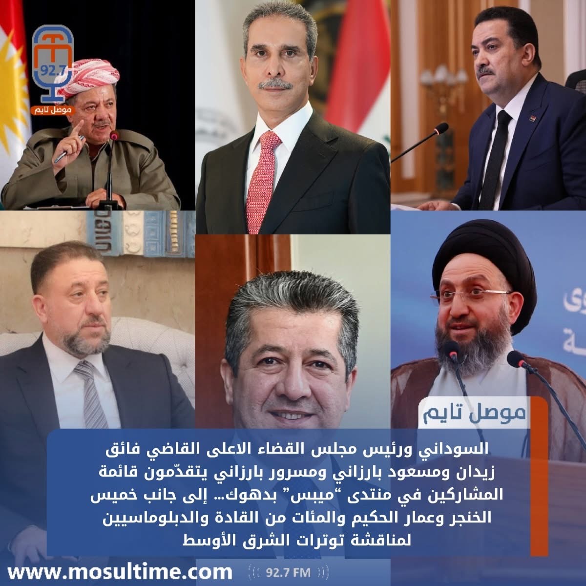 منتدى الشرق الأوسط للسلم والأمن ينطلق في دهوك بمشاركة السوداني وبارزاني وزيدان وقادة سياسيين بارزينتنطلق في مدينة دهوك يومي 18 و19 تشرين الثاني 2025 أعمال الدورة السادسة لمنتدى الشرق الأوسط للسلم والأمن، تحت عنوان “الضوضاء المدمّرة: شرق أوسط جديد؟” بمشاركة واسعة من قادة السلطات العراقية والإقليمية وشخصيات سياسية ودبلوماسية وأكاديمية من دول مختلفة.ويشارك في المنتدى رئيس الوزراء محمد شياع السوداني، ورئيس مجلس القضاء الأعلى فائق زيدان، والرئيس مسعود بارزاني، ورئيس وزراء إقليم كردستان مسرور بارزاني، والرئيس نيجيرفان بارزاني، إلى جانب عدد من القادة السياسيين بينهم خميس الخنجر وعمار الحكيم، فضلاً عن حضور نواب ومسؤولين ودبلوماسيين وخبراء من الشرق الأوسط والعالم.كما تضم قائمة الحاضرين عدد من المحافظين وشخصيات قضائية وأكاديمية من المحافظات العراقية، من بينها محافظ نينوى عبد القادر الدخيل ورئيس محكمة استئناف نينوى القاضي رائد حميد المصلح.وسيبحث المنتدى ملفات خفض التوترات الإقليمية، وتحولات الأمن في الشرق الأوسط، ومستقبل الاقتصاد والطاقة، ومخاطر التصعيد العسكري، وآليات بناء السلام والتنمية المستدامة، إضافة إلى مناقشة التحديات التي تواجه النظام الدولي وفرص التعاون الإقليمي.