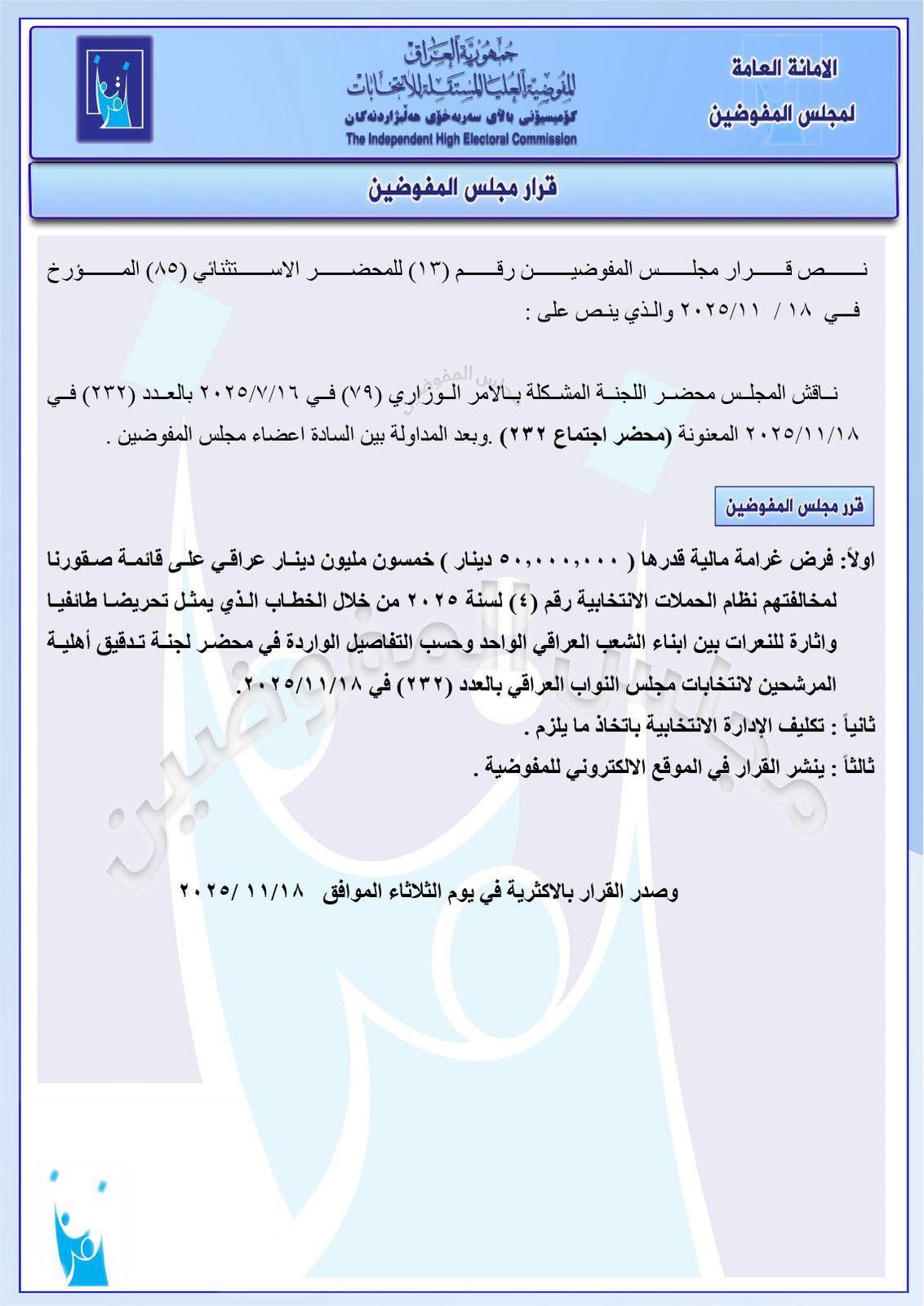 قرر مجلس المفوضين في المفوضية العليا المستقلة للانتخابات تغريم قائمة صقورنا والذي يرأسه يزن مشعان الجبوري بغرامة مادية مقدارها (٥٠) خمسون مليون دينار عراقي.