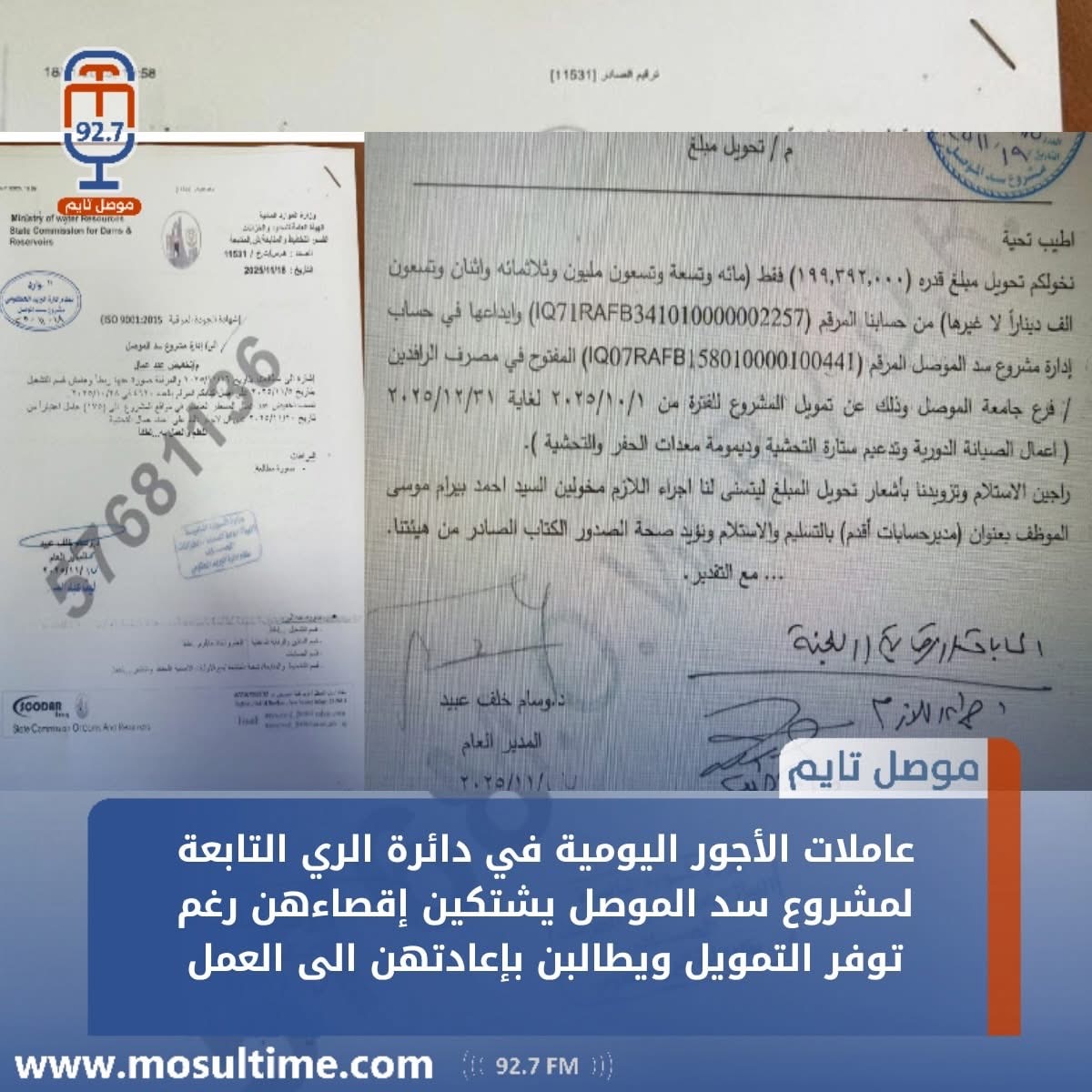 اشتكت مجموعة من النساء العاملات ضمن شريحة الأجور اليومية في دائرة الري التابعة لمشروع سد الموصل من قرار إقصائهن عن العمل، رغم تأكيدهن أن الدائرة حصلت على التمويل الخاص بأجورهن لثلاثة أشهر وفق كتاب رسمي.