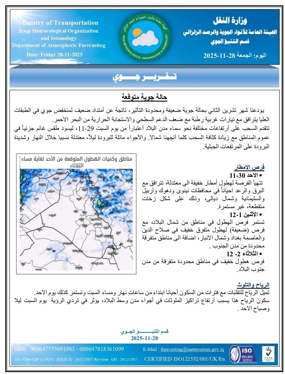 توقع تقرير جوي صادر عن الهيئة العامة للأنواء الجوية والرصد الزلزالي، اليوم الجمعة، ( 28 تشرين الثاني 2025 )، حالة جوية ممطرة ضعيفة ومحدودة التأثير في مناطق محدودة من مدن البلاد، تستمر أيام الأحد والاثنين والثلاثاء من الأسبوع المقبل.