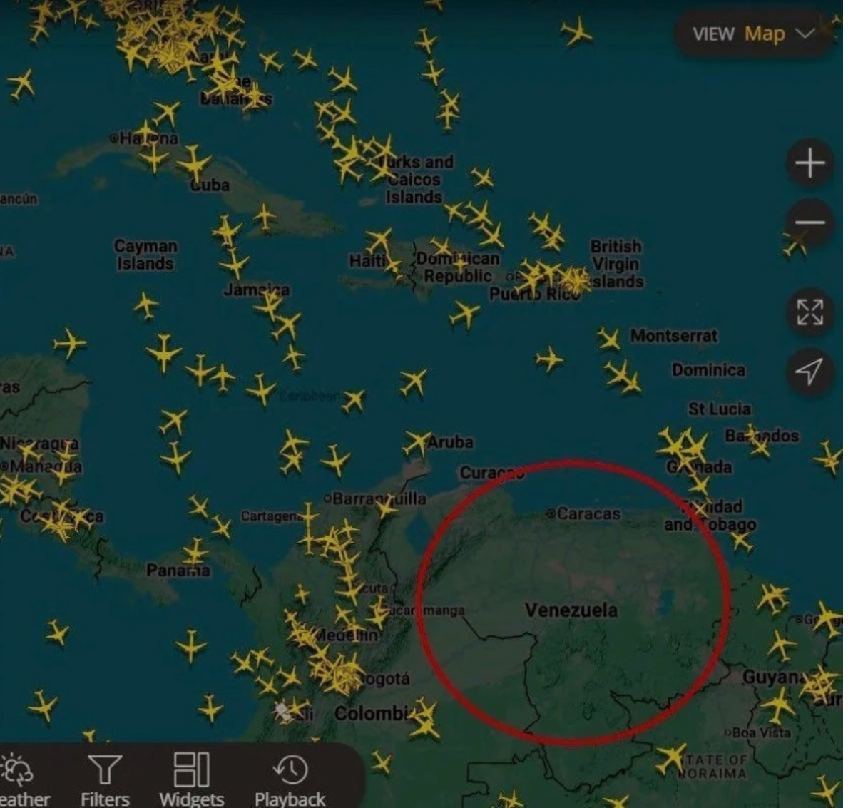 إلى ذلك، أظهرت خرائط الملاحة الجوية العالمية خلوّ أجواء فنزويلا من أي حركة جوية، وذلك بالتزامن مع الإغلاق الجوي الذي فرضته الولايات المتحدة الأمريكية على البلاد.