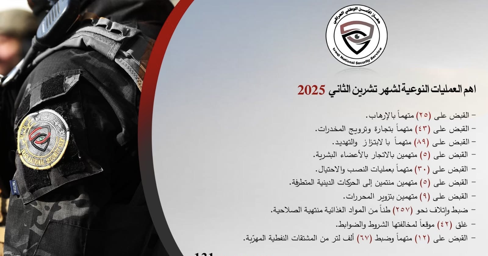 أعلن جهاز الأمن الوطني العراقي، إحصائيات عملياته لشهر تشرين الثاني 2025، وكشف عن اعتقال 218 شخصاً بتهم مختلفة خلال الشهر، وضبط آلاف اللترات من الوقود المهرب وأطناناً من المواد الغذائية منتهية الصلاحية.