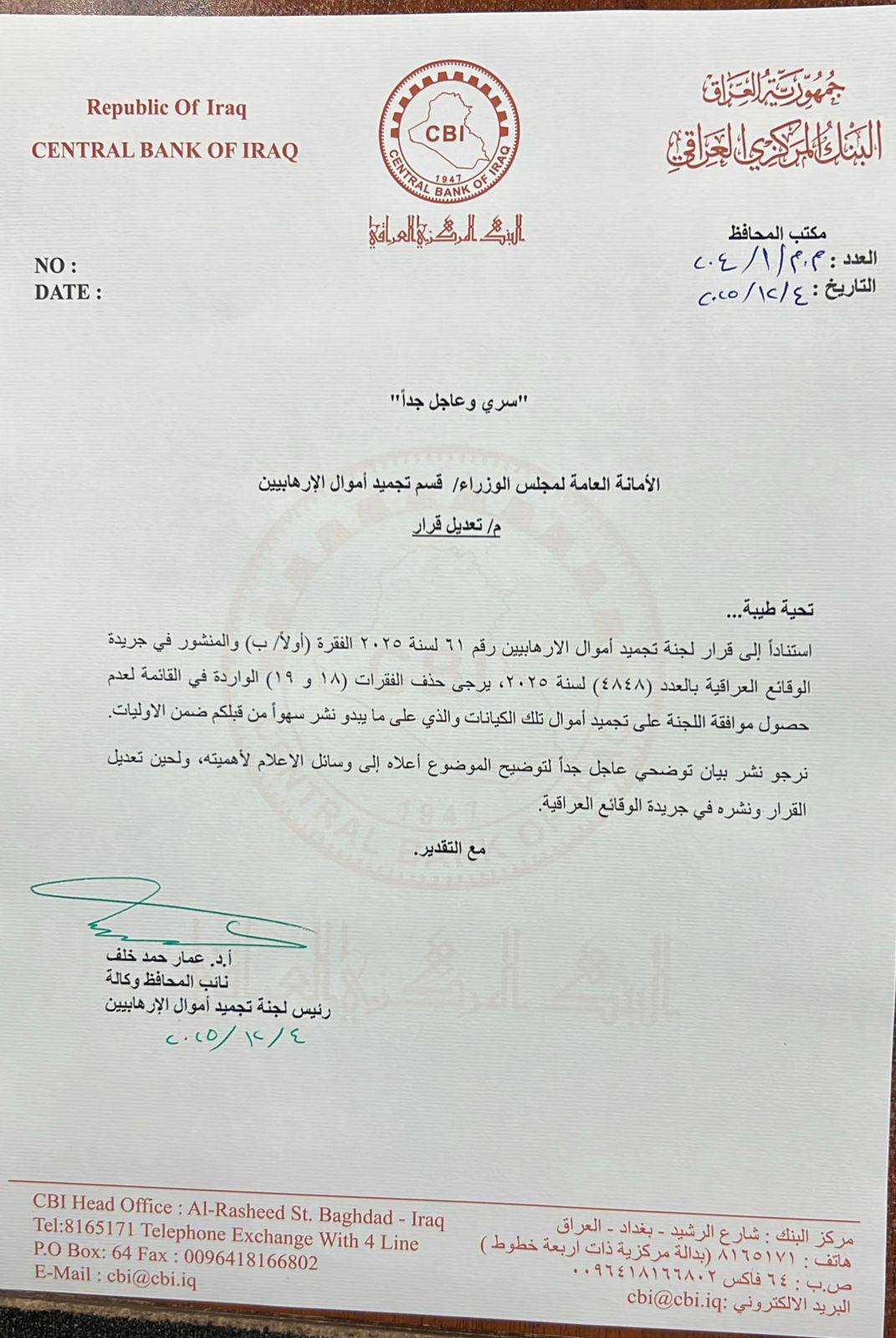 وجّهنا بإجراء تحقيق عاجل وتحديد المسؤولية ومحاسبة المقصرين في ما ورد من خطأ في قرار لجنة تجميد أموال الإرهابيين رقم (61 لسنة 2025)، الذي نشرته جريدة الوقائع العراقية بالعدد (4848) في 17 تشرين الثاني 2025، وما ورد فيه من نصوص عكست مواقف غير حقيقية، إذ إن موافقة الجانب العراقي على تجميد الأموال بناءً على طلب الجانب الماليزي، اقتصرت على إدراج الكيانات والأفراد المرتبطين بتنظيمي داعش والقاعدة الإرهابيين.
