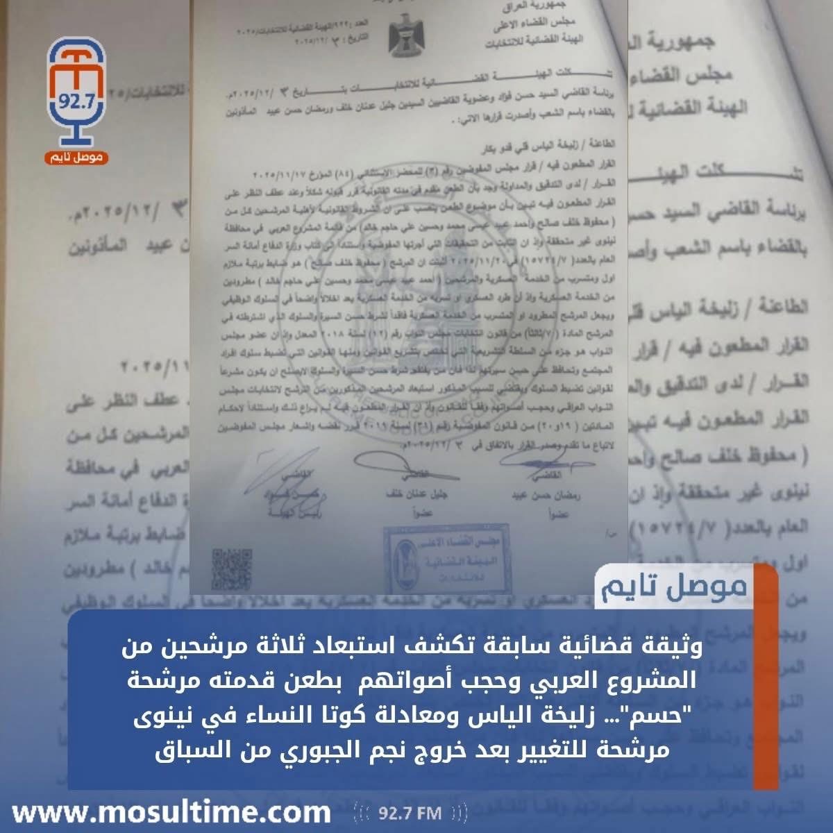 وثيقة قضائية سابقة تكشف استبعاد ثلاثة مرشحين من المشروع العربي وحجب أصواتهم بطعن قدمته مرشحة “حسم”… زليخة الياس ومعادلة كوتا النساء في نينوى مرشحة للتغيير بعد خروج نجم الجبوري من السباق.