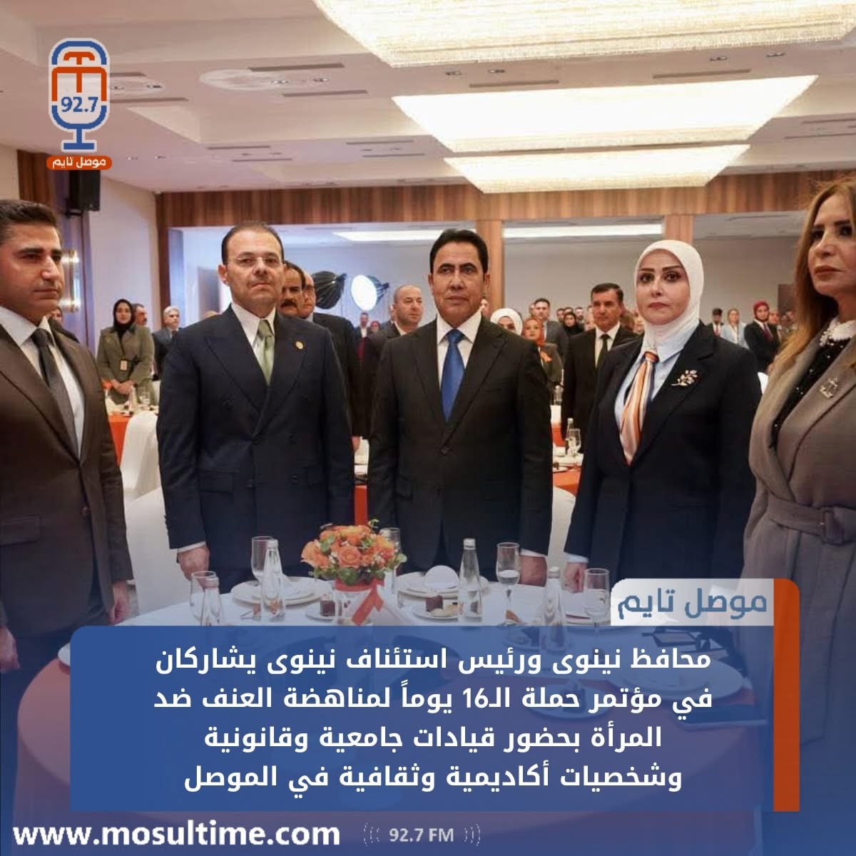 محافظ نينوى ورئيس استئناف نينوى يشاركان في مؤتمر حملة الـ16 يوماً لمناهضة العنف ضد المرأة بحضور قيادات جامعية وقانونية وشخصيات أكاديمية وثقافية في الموصل.
