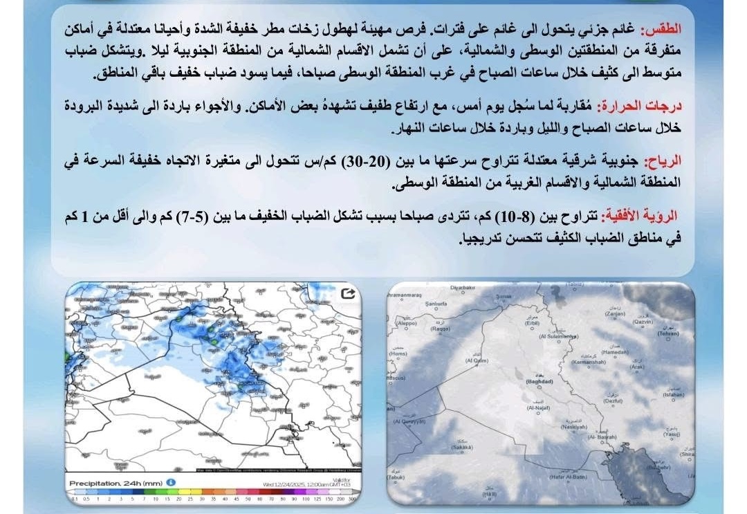 تشير التحديثات الجوية إلى تحسن واضح في فرص الهطول ابتداء من مساء اليوم الثلاثاء ( 23 كانون الأول 2025 )، مع زخات مطرية متفرقة قد تغزر على فترات وبنطاقات جغرافية ضيقة، تتركز بالدرجة الأساس في مدن شمال المنطقة الوسطى وشمال البلاد وشرقها، ولا سيما ديالى وصلاح الدين والسليمانية.