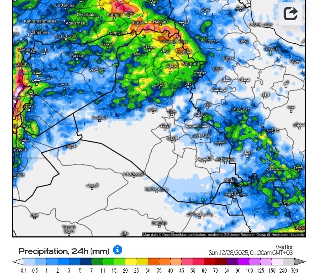 وأوضح أن المنطقة الوسطى والجنوبية قد تشهد تباينا في فرص الأمطار، إذ إن “بعض المناطق لا تشملها الأمطار”، مع عدم استبعاد تشكل بؤر غزارة فجر الأحد على المناطق الحدودية مع إيران، وبؤر غزارة متفرقة في بعض مدن الوسط على فترات.