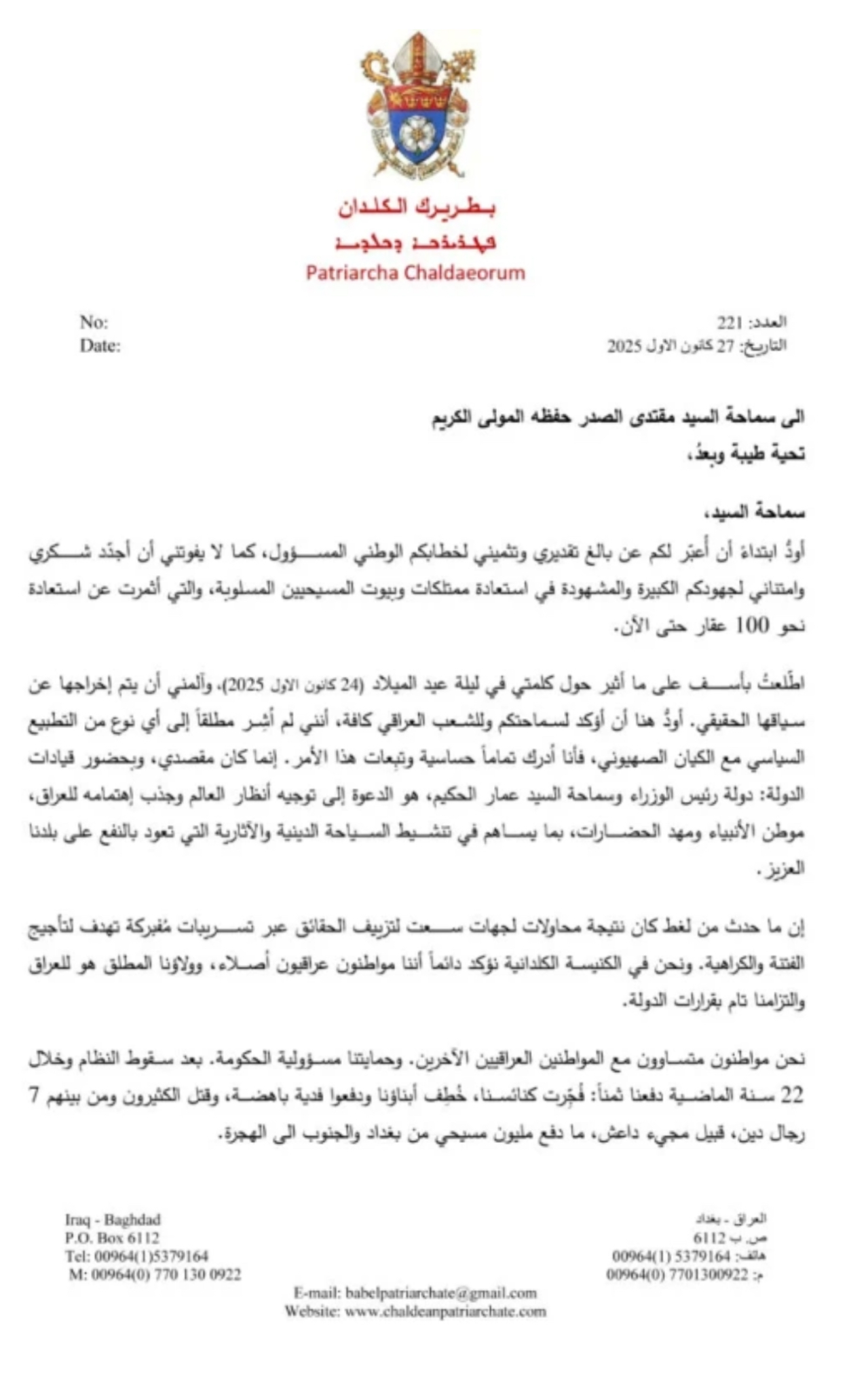 أرسل الكاردينال لويس روفائيل ساكو، اليوم السبت ( 26 كانون الأول 2025 )، رسالة الى زعيم التيار الوطني مقتدى الصدر، أكد من خلالها رفضه التطبيع مع الكيان الصهيونى، وذلك بعد الجدل الذي احدثته كلمته خلال قداس أعياد الميلاد.