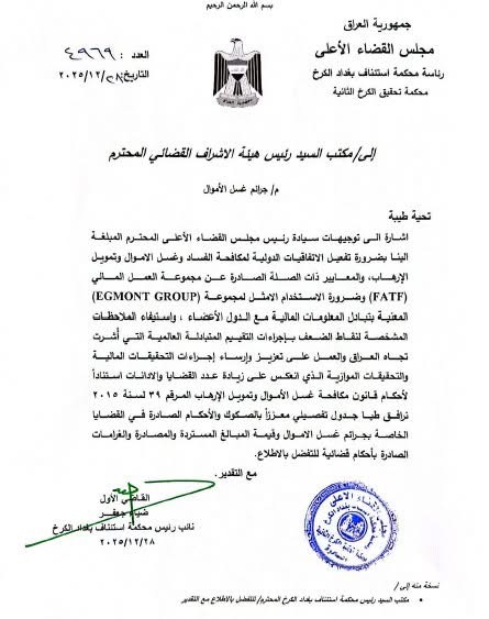 ان مجلس القضاء الأعلى شدد على ضرورة تفعيل الاتفاقيات الدولية لمكافحة الفساد وغسل الأموال وتمويل الإرهاب والمعايير ذات الصلة الصادرة عن مجموعة العمل المالي ( FATF ) وضرورة الاستخدام الأمثل لمجموعة (EGMONT GROUP) المعنية بتبادل المعلومات المالية مع دول الأعضاء.