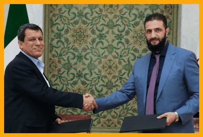 🔸تسليم محافظتي دير الزور والرقة إدارياً وعسكرياً للحكومة السورية بالكامل فوراً، ويشمل ذلك استلام كل المؤسسات والمنشآت المدنية مع إصدار قرارات فورية بتثبيت الموظفين الحاليين ضمن الوزارات الاختصاصية التابعة للدولة السورية، والتزام الحكومة بعدم التعرض لموظفي ومقاتلي قسد والإدارة المدنية في المحافظتين.