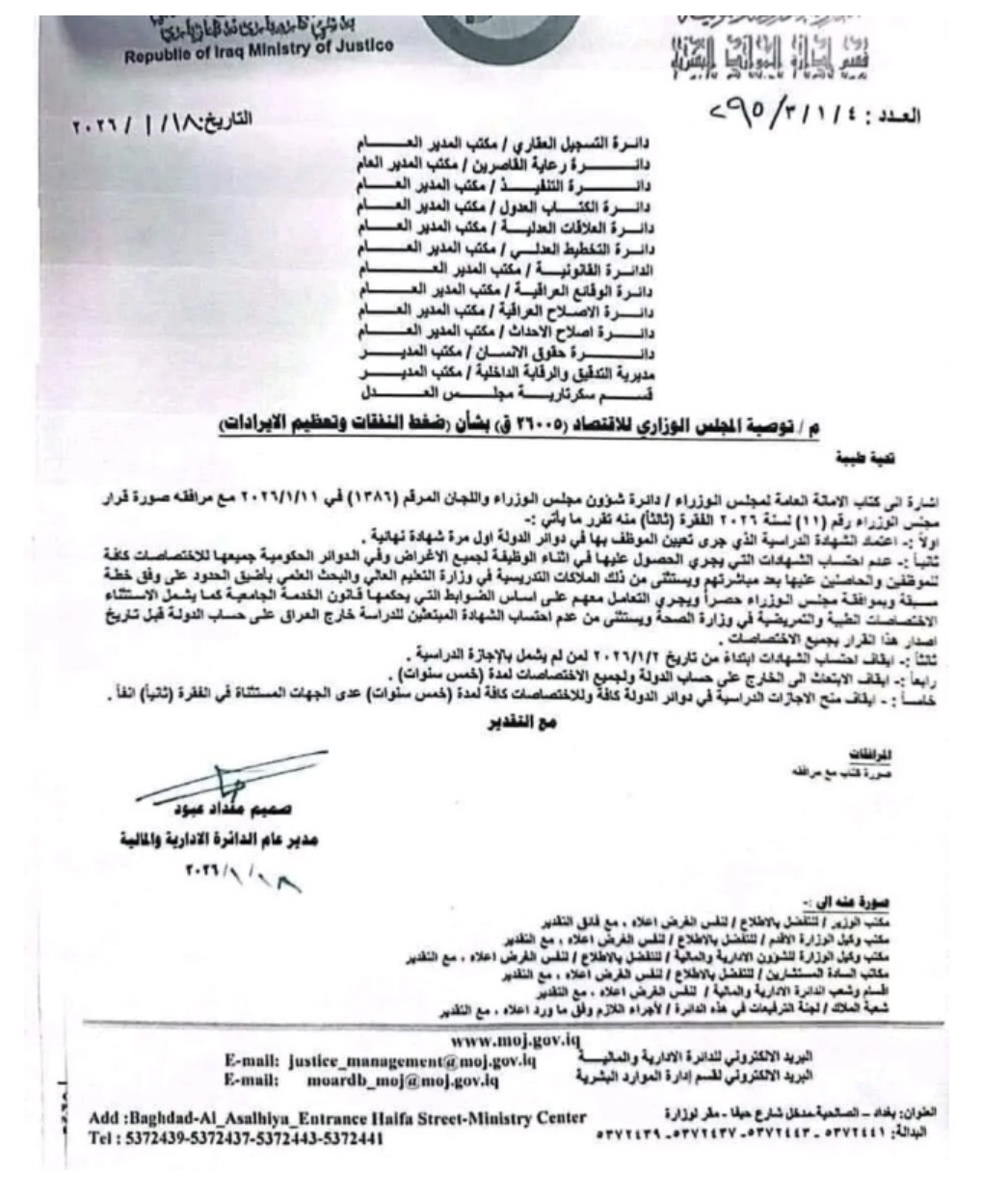أعلنت وزارة العدل، اليوم الإثنين ( 19 كانون الثاني 2026 )، عن وصول توصية المجلس الوزاري للاقتصاد بشأن ضغط النفقات وتعظيم الإيرادات إلى جميع الوزارات والمؤسسات الحكومية، والقاضية بإيقاف احتساب الشهادات الدراسية التي يحصل عليها الموظفون أثناء الخدمة في الدوائر الحكومية كافة.