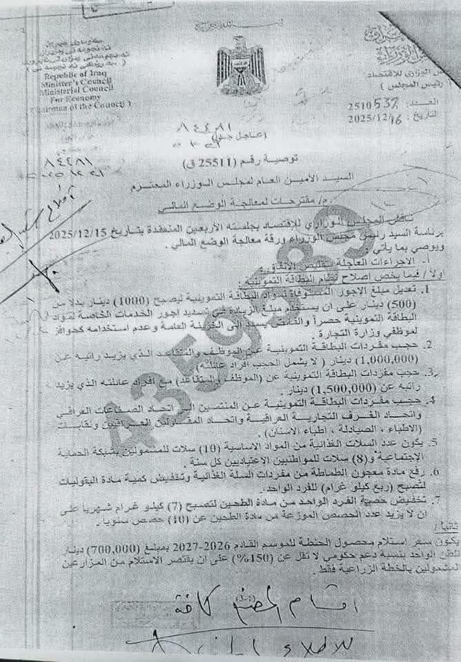 2-حجب مفردات البطاقة التموينية عن (الموظف والمتقاعد) مع إبقاء عائلته التي لا يتجاوز دخلها مبلغ (1,500,000) دينار.