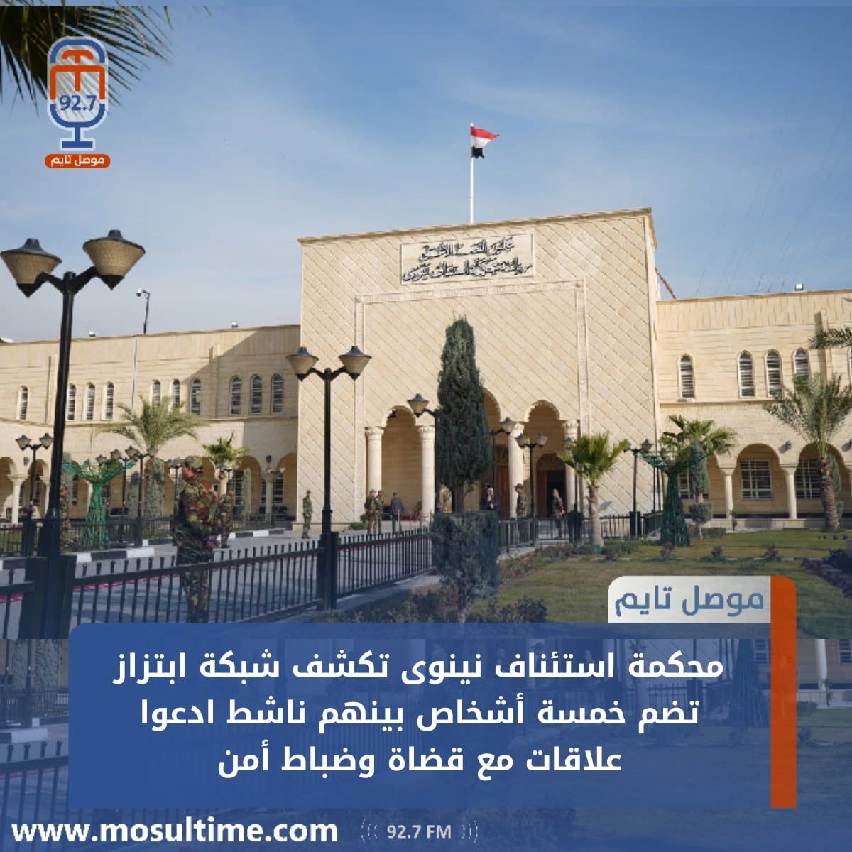 أعلنت رئاسة محكمة استئناف نينوى، اليوم الخميس، تفكيك شبكة ابتزاز مكوّنة من خمسة أشخاص، بينهم ناشط معروف في الموصل، بعد ادعائهم امتلاك علاقات مع قضاة وضباط أمن مقابل مبالغ مالية.