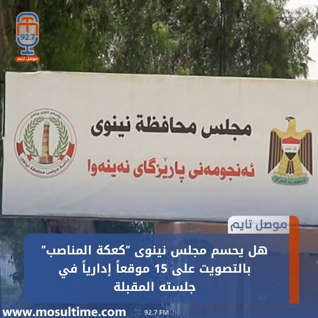 وقال المصدر في حديث تابعته “موصل تايم ” ، إن الجلسة المرتقبة الثلاثاء المقبل ستتضمن التصويت على تعيين 15 شخصية إدارية بديلاً عن عدد من مدراء الدوائر ومدراء الأقسام في دوائر المحافظة، بما فيها دوائر غير المنتظمة بإقليم، مشيراً إلى أن توزيع المناصب جرى وفق تفاهمات بين الكتل السياسية.