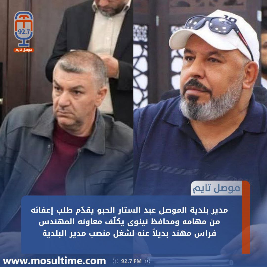 وقال المصدر لوكالة موصل تايم، إن المحافظ وافق فوراً على طلب الإعفاء، وكلّف معاون مدير البلدية المهندس فراس مهند (فراس السلطان) بتولي مهام المنصب بشكل مؤقت، وذلك لضمان استمرار سير العمل وعدم تأثر الخدمات البلدية في المدينة.