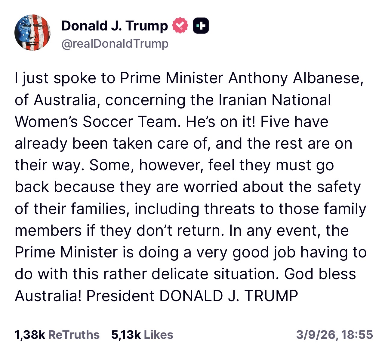 وكتب ترامب على منصته “تروث سوشال” أن الحكومة الأسترالية “ترتكب خطأ إنسانياً فادحاً” بالسماح بإجبار المنتخب النسائي على العودة إلى إيران، مضيفاً أنه “من المرجح قتل عضوات الفريق” .