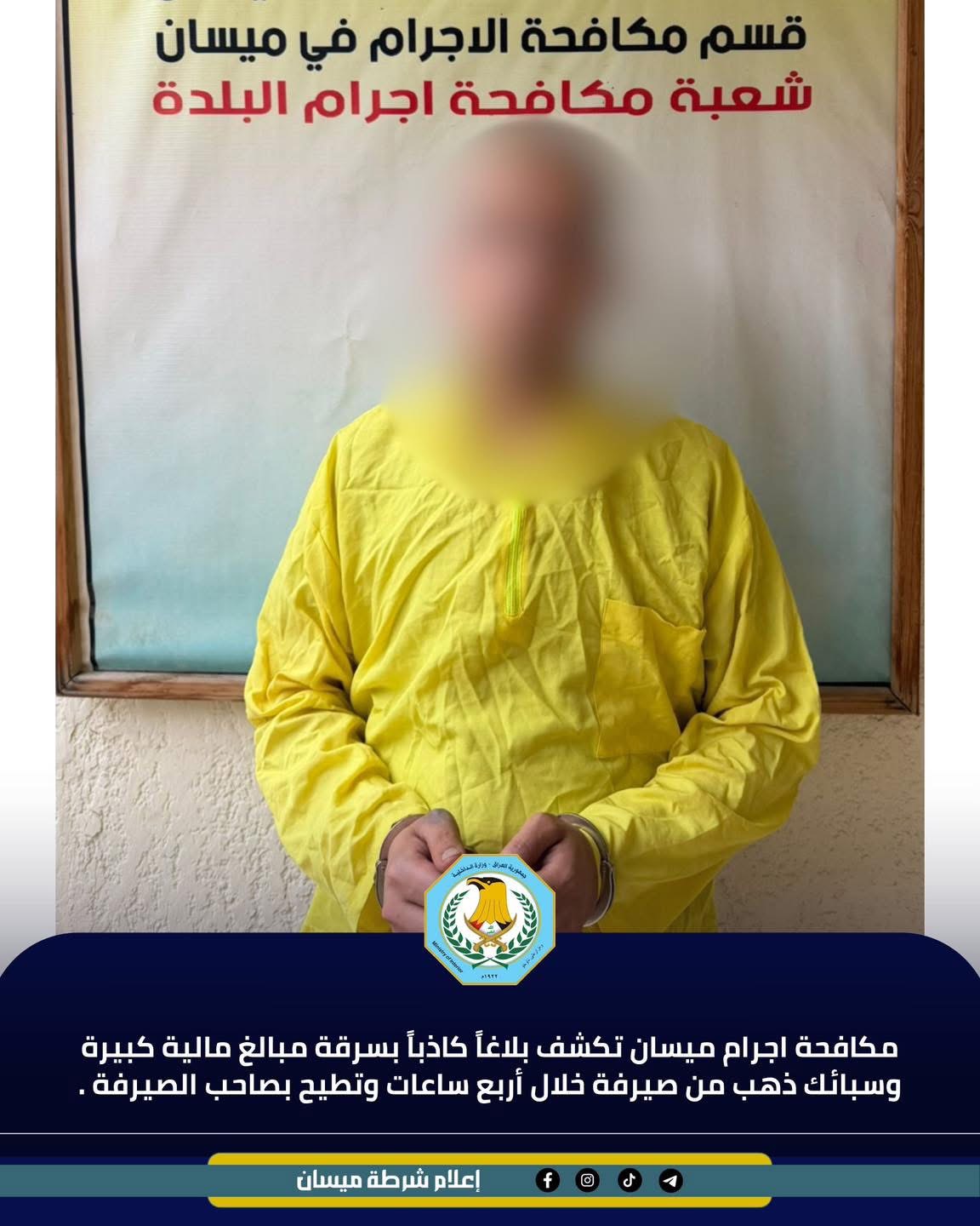 كشفت قيادة شرطة محافظة ميسان، اليوم الأربعاء، تفاصيل واقعة مثيرة ادعى فيها صاحب أحد مكاتب الصيرفة تعرضه لسرقة مبالغ مالية ضخمة وسبائك ذهبية، ليتبين لاحقاً أنه هو من دبّر الحادثة بنفسه بهدف التهرب من أزمة ديونه.