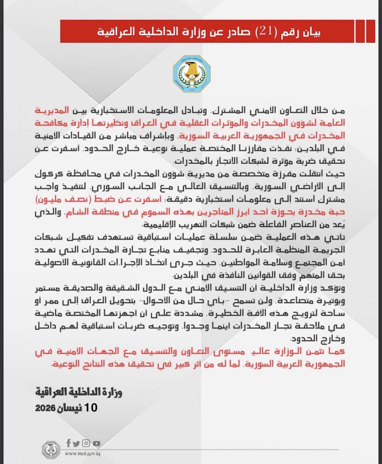 أعلنت وزارة الداخلية، اليوم الجمعة (10 نيسان 2026)، عن نجاح عملية أمنية استباقية نفذتها خارج الأراضي العراقية، بالتعاون مع إدارة مكافحة المخدرات السورية. وأسفرت العملية عن مصادرة نصف مليون حبة مخدرة كانت بحوزة أحد كبار تجار المخدرات في منطقة الشام.