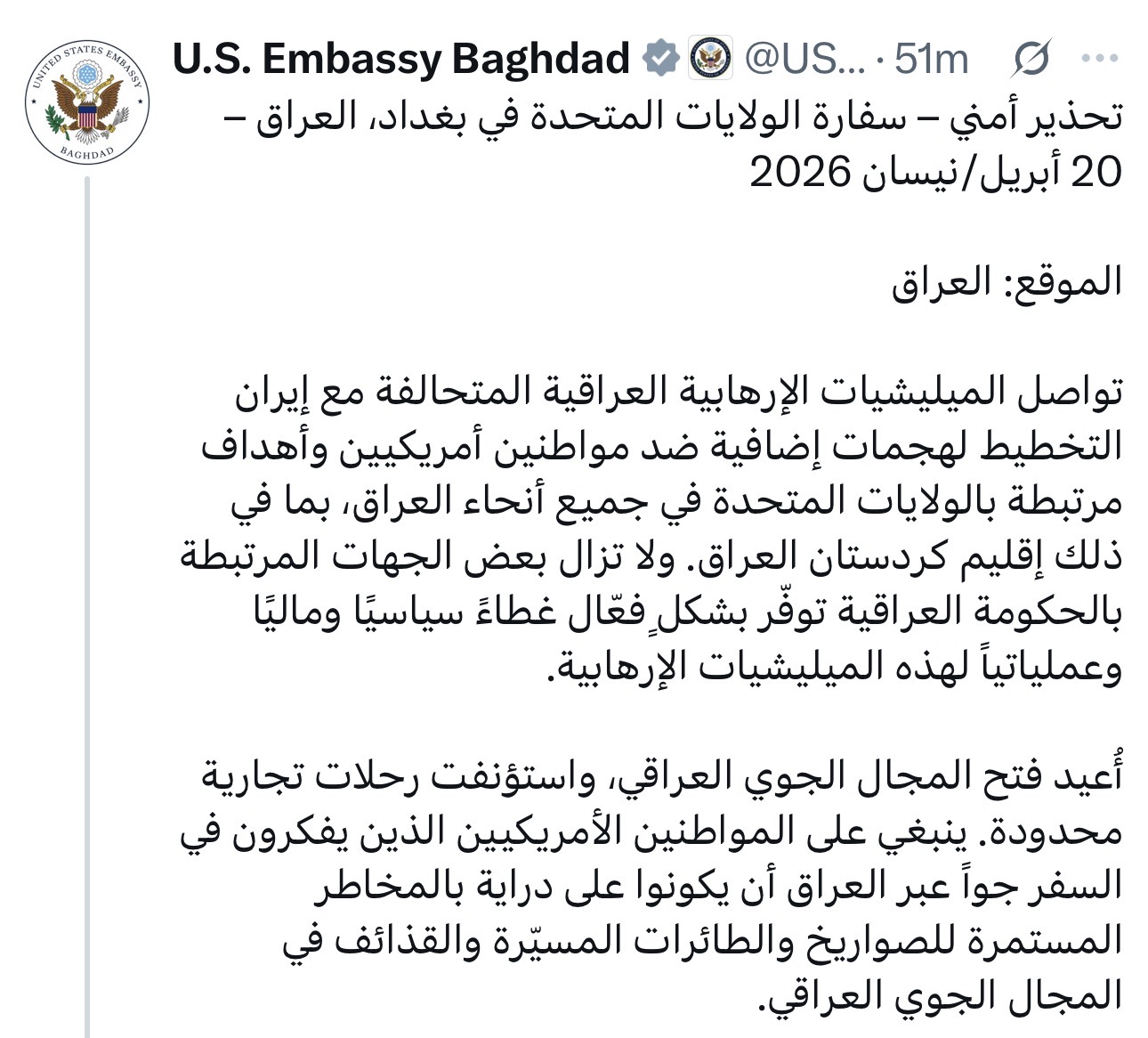 وفي شأن متصل، أعلنت السفارة أن “المجال الجوي العراقي أُعيد فتحه، واستؤنفت رحلات تجارية محدودة”، محذرةً المواطنين الأمريكيين الذين يفكرون في السفر جواً عبر العراق من “المخاطر المستمرة للصواريخ والطائرات المسيّرة والقذائف في المجال الجوي العراقي”.