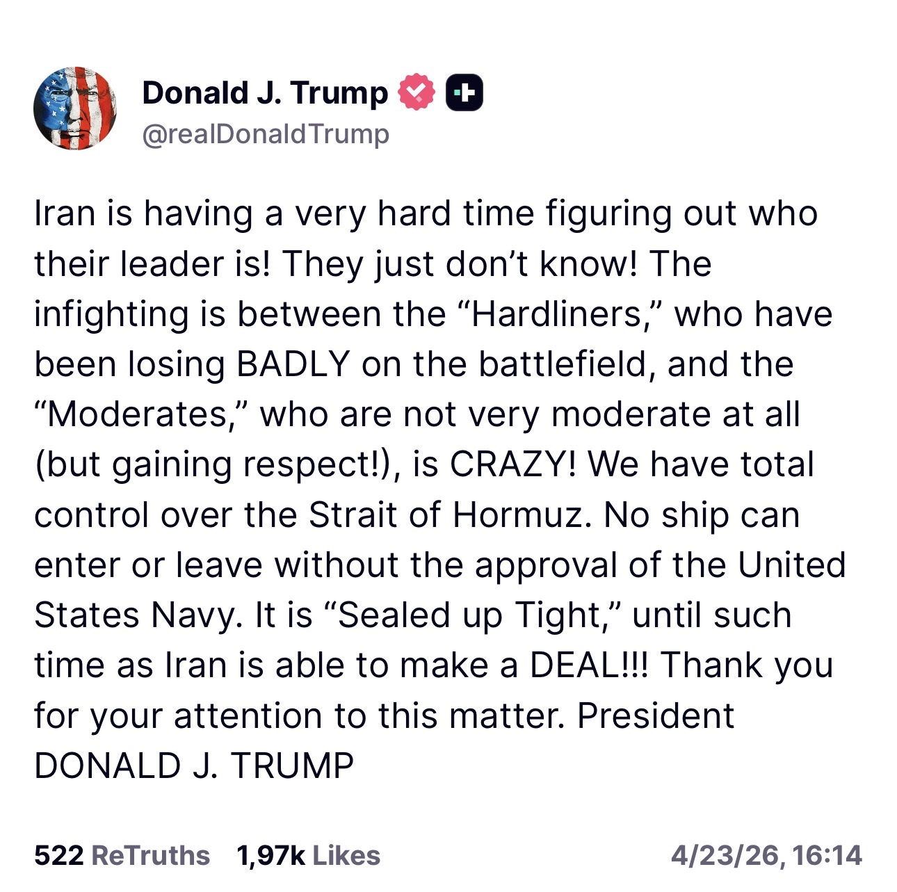 وقال ترامب في تغريدته: “لدينا سيطرة كاملة على مضيق هرمز. لا يمكن لأي سفينة الدخول أو المغادرة دون موافقة البحرية الأمريكية. إنه ‘مختوم بإحكام’، حتى الوقت الذي تكون فيه إيران قادرة على إبرام صفقة!!!”