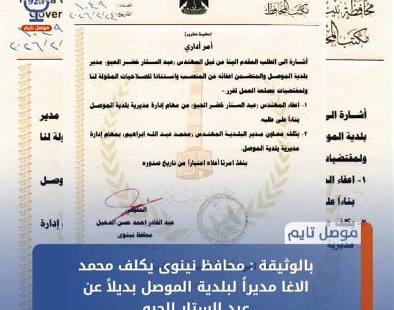 - بالوثيقة.. محافظ نينوى يكلّف محمد الأغا بمهام مدير بلدية الموصل بدلاً عن عبد الستار الحبو